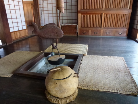 よくある普通の和室 「古材の柱」で作った「自在ガキ」をぶら下げ、囲炉裏風の設えに。
