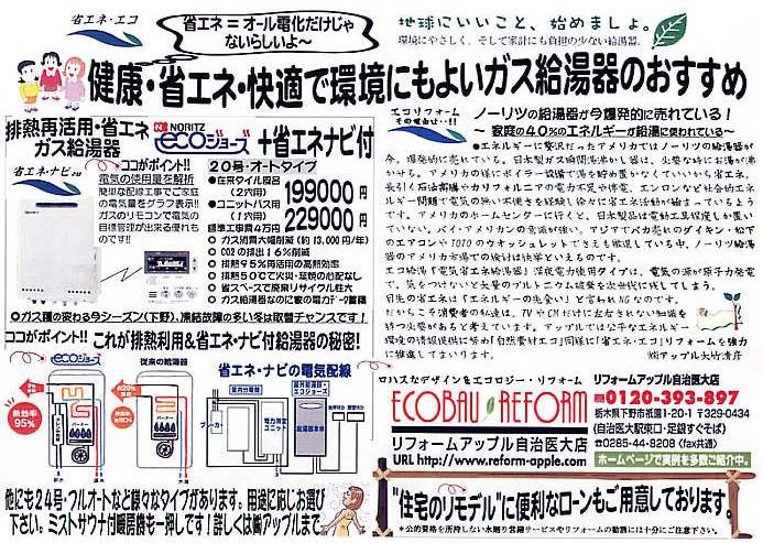 バイ・アメリカンの意識が強い。アジアでバカ売れのダイキン・松下のエアコンやTOTOのウオッシュレットでさえも撤退している中、ノーリツ給湯器のアメリカ市場での検討は快挙といえるのです。 エコ給湯「電気省エネ給湯器」深夜電力使用タイプは、電気の源が原子力発電で、気をつけないと大量のプルトニウム破棄を次世代に残してしまう。 目先の省エネは「エネルギーの先食い」と言われNGなのです。 だからこそ消費者の私達は、TVやCMだけに左右されない知識を持つ必要があると考えています。アップルでは公平なエネルギー環境の情報提供に努め「自然素材エコ」同様に「省エネ・エコ」リフォームを強力に推進してまいります。 .jpg)