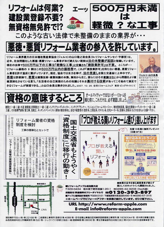 私達リモデラーと呼ばれるものにとって、リフォームは部分的とはいえ家を壊します。そして、作り替えを行う以上お客様の生命と財産に対して、明確な責任と使命を負います。そのためも、お客様に代わり法律知識、構造、施工、計画のプロでなくてはならず、専門知識と豊富な経験が必須となります。つまり建築業許可、建築士免許は担当を担うのには最低必要不可欠ということです。今年6月建築基準法が改正されました。例えば、1年後に「材木のプレカット工場」ですら許可、資格制に変わる可能性が大きいのです。リフォーム業界も同様「無許可・無資格者」で荒らされる点では同様で、今更言うまでも無く、この動きは消費者にとって最もウエルカムといえるものでしょう。これまで野放図のリフォーム業界の現状をやっと国土交通省が把握しました。わたしたちも、今後の法制度が変わっていくことを見守り、楽しみにしたいものです。 もし、怪しげなリフォーム販売業者に出くわしたら、下記までご連絡ください。