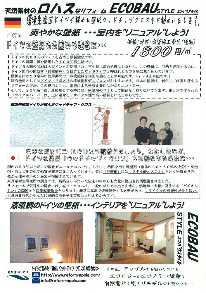 EU諸国の中でもとりわけ『環境先進国』で知られるドイツ。1970年代のルール地区の煤煙公害問題をきっかけに市民活動に拍車がかかり『緑の党』の躍進で環境・エネルギー政策を中心とした『持続可能な循環社会』の実現に取り組んできました。70年代からすすめた小学高からの『環境教育』の洗礼を受けた『環境戦士』が今のドイツの世論の中心です。年金とリンクさせた『環境税』『石油税』の導入と企業の雇用促進は順調に進んでいます。持続可能な代替エネルギーでは、風力、太陽光、水力、地熱、バイオマスなどが多岐にわたり行われています。2003年からは山林での『間伐材』の放置が禁止となりました。放置すれば法律違反で、ただのゴミとなる『間伐材』。しかし、ドイツでは今から20年以上も前から、この『間伐材』を再利用=リサイクルする行動がすでにありました。『間伐材』細かく粉砕し『ウッドチップ』とすることでした。20年以上前から、そして、今でもずっと使い続けられている『リサイクル・ウッドチップ壁紙』がドイツで、約80%のシェアを占める『オガファーザーNEW』壁紙です。ドイツの新聞古紙を活用した100%再生紙です。そして、ドイツの5大新聞紙の印刷は大豆インクが使用され、再生時に漂白処理は行いません。この壁紙の特徴は、凹凸を表現するのに、先のドイツ国内の間伐材(針葉樹林)を粉砕したウッドチップと呼ばれるものを紙に漉き込んでいます。壁紙自体は20余年の使用期間で、上から漆喰塗料を何回も塗ることが可能です。(7〜8回可能です。)一度張り付けた後の再施工は、ドイツ自然素材の総合メーカー・リボス社の漆喰塗料デュブロンがおすすめです。