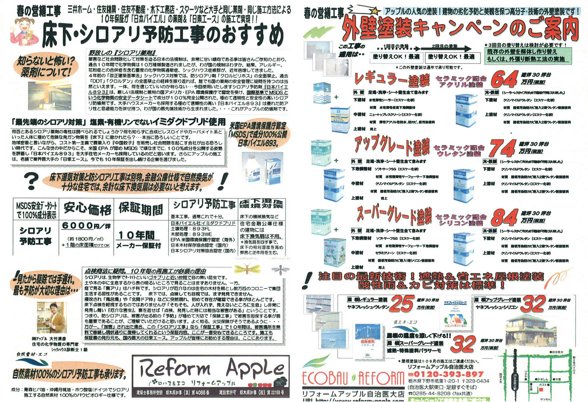 外装や屋根という住宅の維持管理に欠かせない営繕工事がこの塗装。工事に最適なシーズンが到来いたしました。1〜2月の底冷えのする、また、屋根に霜が降りる冬期の塗装はアップルでは行いません。なぜならば、冬季の木枯らしで壁面には多量の埃を被る。特に凍結、夜露、霜で塗れる屋根面の塗装は、午前10時から午後2時までと衛生管理法で決めれれたものだからです。作業が危険で、温度が上がらず、塗膜の乗りが悪い時期に塗装をあえて行う必要はないからです。アップルのこの最適時期の、春の塗装キャンペーンでは、屋根の遮熱塗装が今話題です。日本特殊塗料の「パラサーモ」は航空機で70年の実績から生まれた「屋根専用・遮熱塗料」。省エネには欠かせなくなた遮熱をわたしたちアップルではお勧めいたしております。 外装では、@一般的な石油系塗料(有機質・石油製品)による塗装を3つのグレードからお選びいただいております。これらは塗り替え用として素晴らしい性能を持つものですが、原則的には2回目までの用途となります。つまり、3回目の塗装では検討が必要ということになります。新築時〜過去の塗り替えに使用した塗膜は劣化を起こし下地から剥離を起こすからです。最近多く採用いただくA漆喰塗り(無機質・鉱物)はイニシャルコストは割高でも漆喰の持つ独特のテクスチャ、素材感、寿命の長さ、強アルカリ性の防カビ性能などが評価され使われる方が年々増えております。また、以前からサイディング張りはありましたがB外張り断熱・カバー工法の普及で外装をグレード感のあるものにリモデルされる方も大変多くなっております。その場合、今の外壁を解体し外装をやりかえる事無く、建物を覆う軽量カバー工法がお勧めです。このカバー工法の場合は、外壁の重量が基礎などの構造材に負担が多く、耐震性能に影響を及ぼすタイル(重量)パネルは大いに検討が必要です。このリモデルには耐震診断と基礎の配筋調査が不可欠となります。