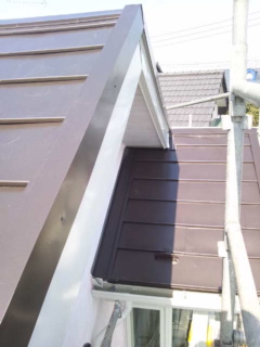 下屋: 平部とコーナー部材(役物)、雨押えの施工 全てGL製の遮熱鋼を使った板金です