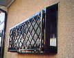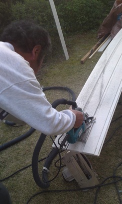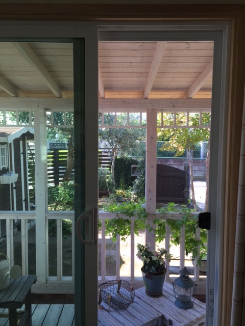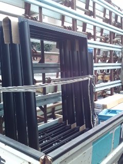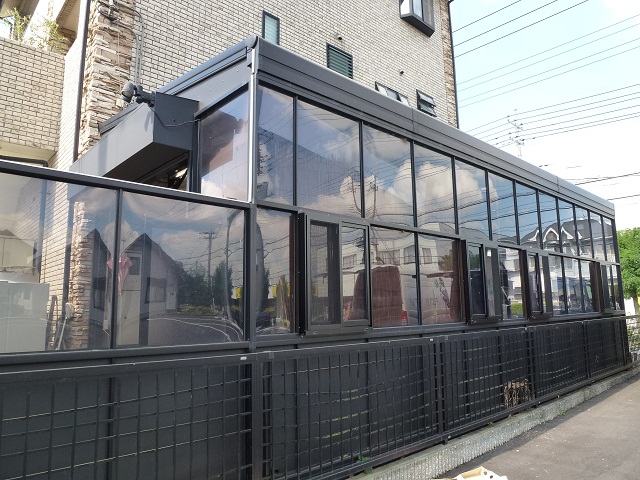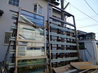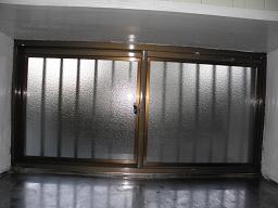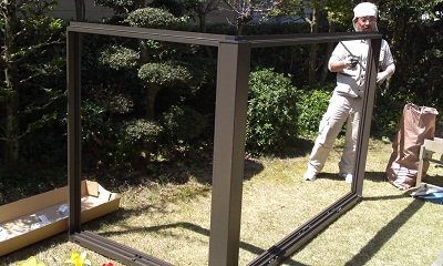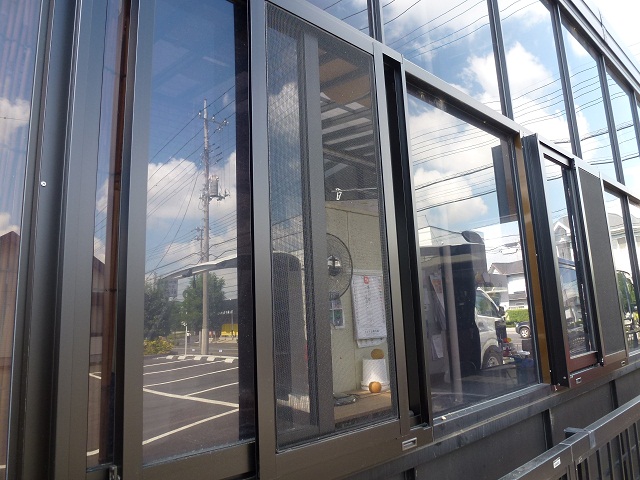 アルミ製ストックヤード・後付け窓加工: 通風サッシ+既存ポリカーボ壁材ハメ込み+網戸