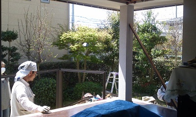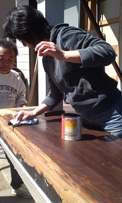 お客様参加の天板塗装(ドイツ・リボス自然塗料)