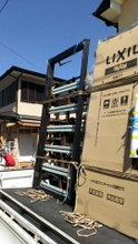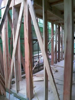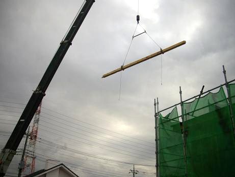 4寸角のと押し柱が吊り上げられ2件先の現場に続々と到着