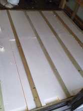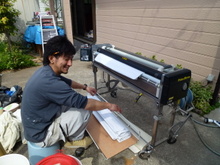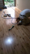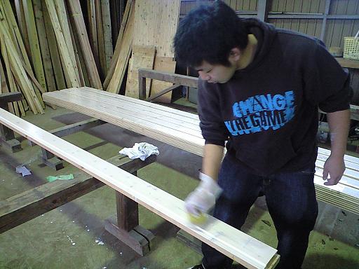 大工の作業場で着色する天井用羽目板はドイツ・リボス社の自然塗料で