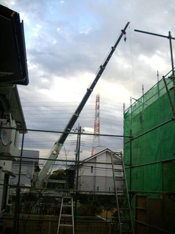 いよいよ建前、狭小な隣地境界の制約上、何と2件もの隣の庭を通過させ構造材を搬入する離れ業です クレーンのアームが見事に2件の上空を通過