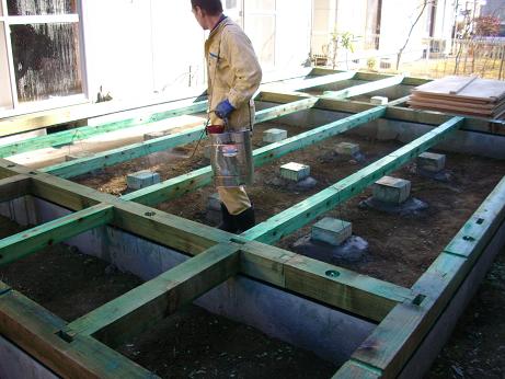 基礎パッキンに土台引き終え、防蟻工事(土壌と木部処理)です