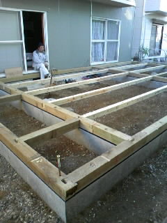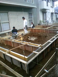 大工工事の前に、増築部分にまず基礎コンクリートを打設しますが、そのための型枠準備です。既存のセキスイハウス側は防湿コンクリートもない普通の布基礎です。これには初期の現場調査の段階で驚きました。