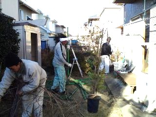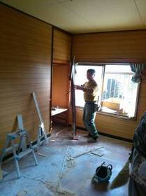 着工前日は庭の片付けや清掃、雑物の移動などを行います。現場説明を大工さんに行いました。大工さんに既存の壁を少し剥がしてもらい、構造材の高さを測ってもらいます。既存に合わせた工事となるため、これが正確にわからないと加工ができません。