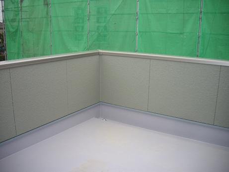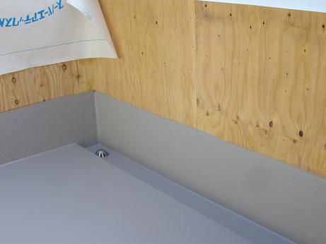 ルーフバルコニーの防水はFRP5層 雨水ドレインの下部は3尺突き出しの軒天井