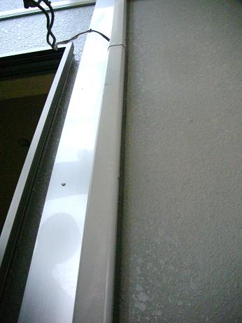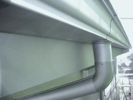 下に隠れる破風板はGL鋼板巻き、表側の雨樋(軒、縦)も同色素材GL鋼板製