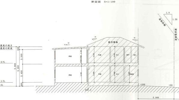 下の図は確認申請書に添付した図面の一部の断面図ですがむしろ、ぬるい勾配の既存屋根と下屋との接合部分の雨仕舞いや構造同士の接合素材や先のエクスパンションジョイントの取り合いなど心配された実際の技術面もすんなり施工を進めることができました。