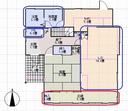 台所+浴室+洗面脱衣室 ⇒リビングに集約